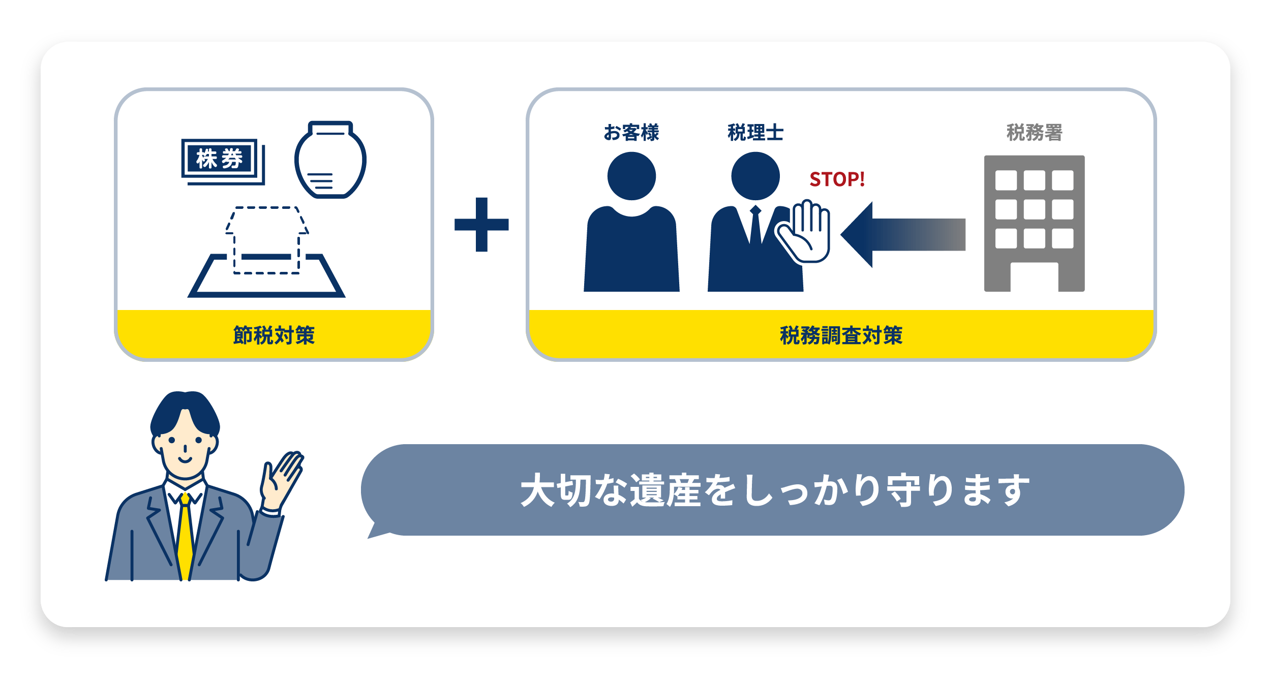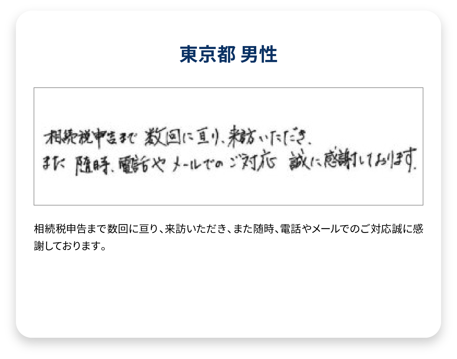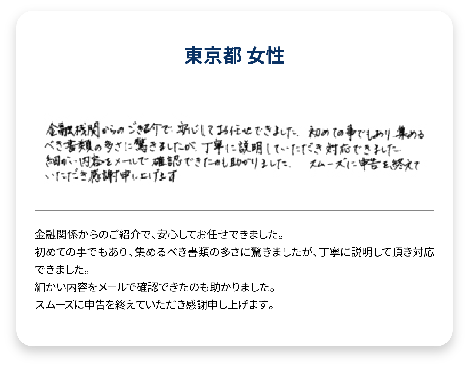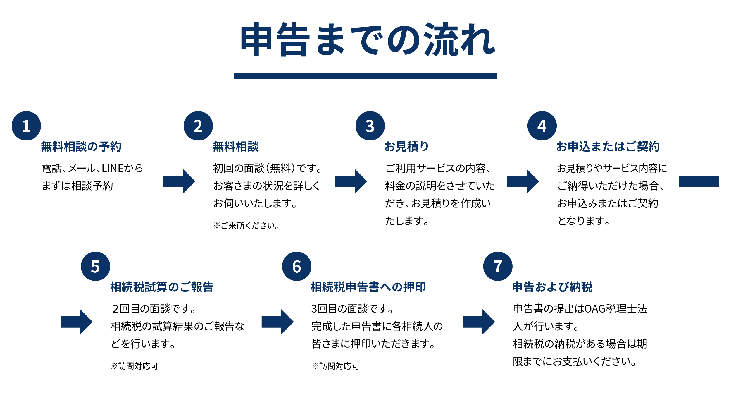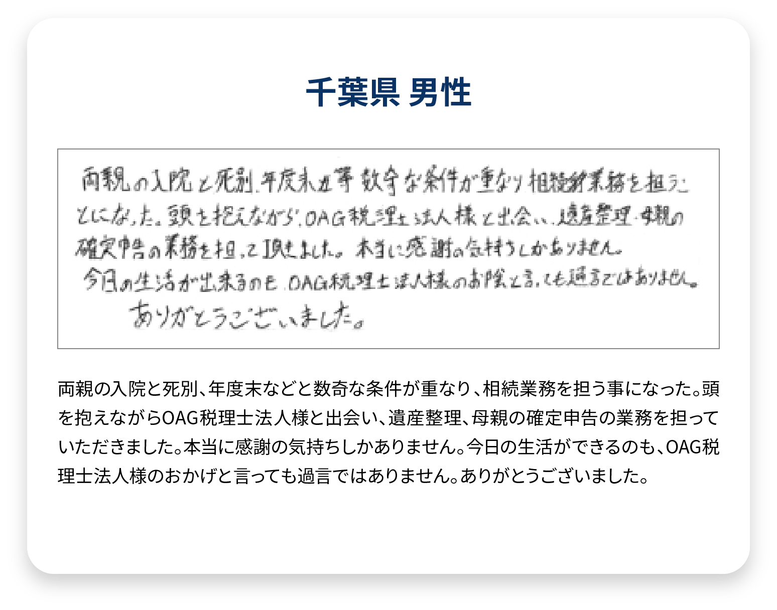 税務署から「相続税の申告等についてのご案内」もしくは「相続税についてのお知らせ」などの封書がとどいた場合でもご安心ください。他社様で申告した案件でも初回相談は無料でお受けします。また、有料となりますが相続のお尋ねに対する書面作成もお受けいたします。OAGコンサルティンググループでの申告案件の税務調査率は2. 5%ですので、指摘部分を的確に把握の上、お客様に代わって対応いたします。