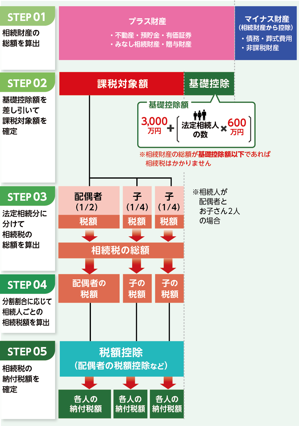 相続税の早見表を活用するには、まず計算の全体像を理解しておくことが大切です。相続税は次の5つのステップで算出されます。