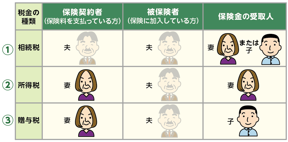次の①~③のパターンでいずれも被保険者が死亡した場合の税金の種類は次のとおりとなります。(いずれも夫が死亡したケース)
