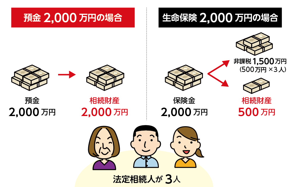 現金や不動産にはない「法定相続人×500万円」の非課税枠を利用できることが、生命保険の最大の特長です。法定相続人の数に応じて非課税枠を使えるため、相続税の負担を大きく軽減できます。たとえば相続人が3人いる場合、1,500万円まで非課税となります。生前に預貯金を生命保険に充てるだけで、相続財産そのものを減らすことができ、大きな節税につながります。