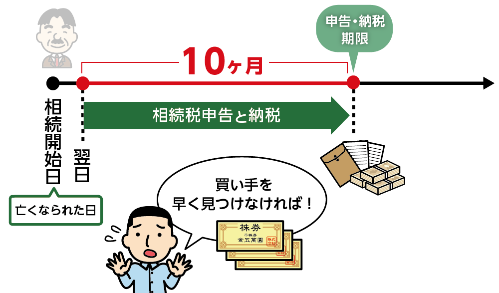 そのため、株式を現金化したい場合は、買い手を自分自身で見つけ出す必要があります。多くの場合、会社や他の株主、あるいは親族などが候補となりますが、買い手が見つからなければ現金化は困難になります。相続税の納付期限(相続開始から10か月以内)までに現金が準備できない事態も起こり得ます。