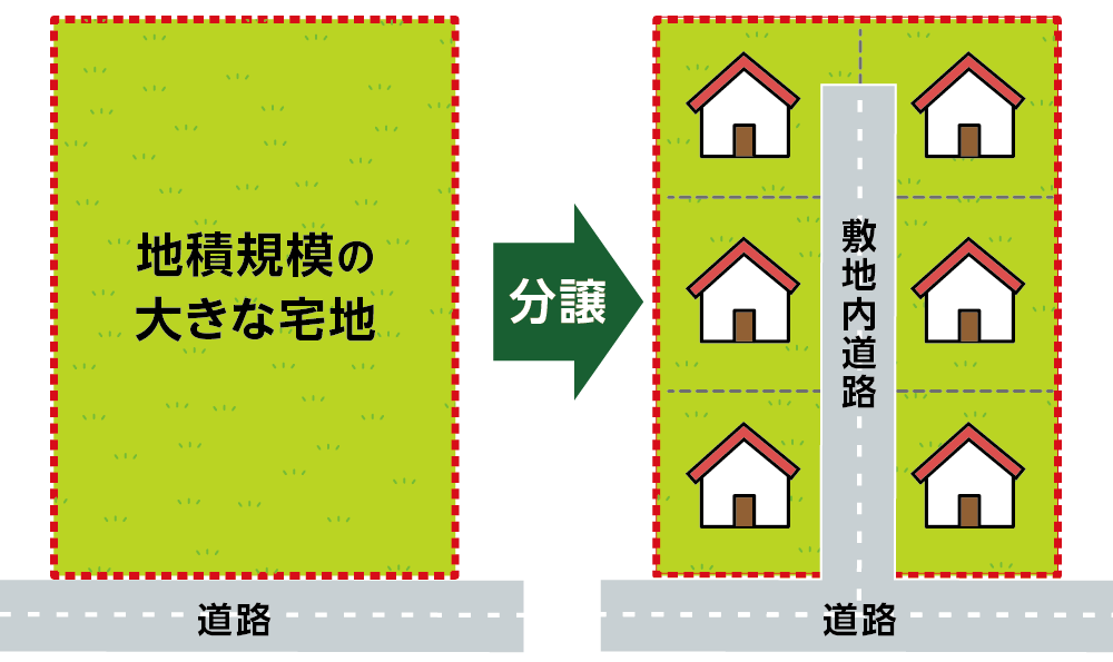 一見すると「大きな土地=価値が高い」と思われがちですが、実際にはそのままでは買い手がつかず、複数の区画に分割して売却するのが一般的です。このとき、新たに敷地内道路を設ける必要があり、宅地として利用できる有効面積が減少してしまいます。