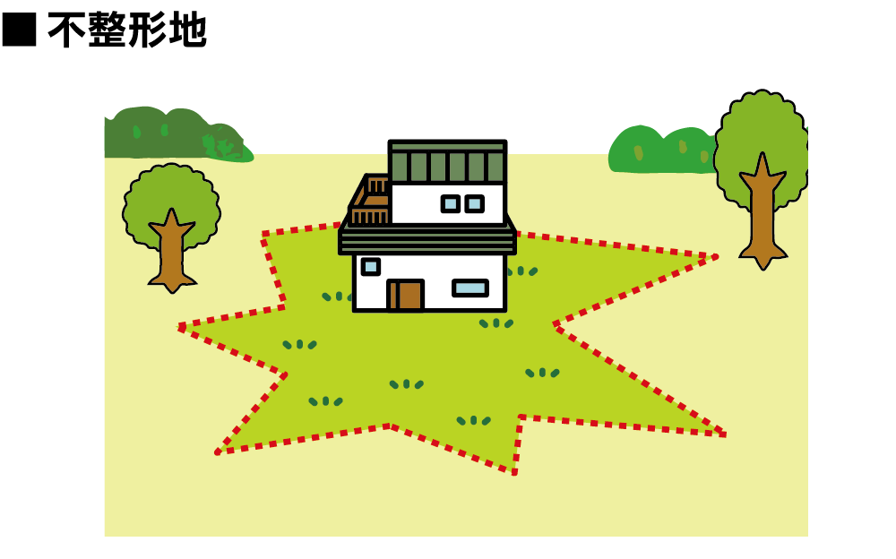 不整形地とは、四角形ではない、いびつな形をした土地のことです。正方形や長方形の土地と比べて利用しにくく、価値が低いとみなされるため、評価額を減額することができます。