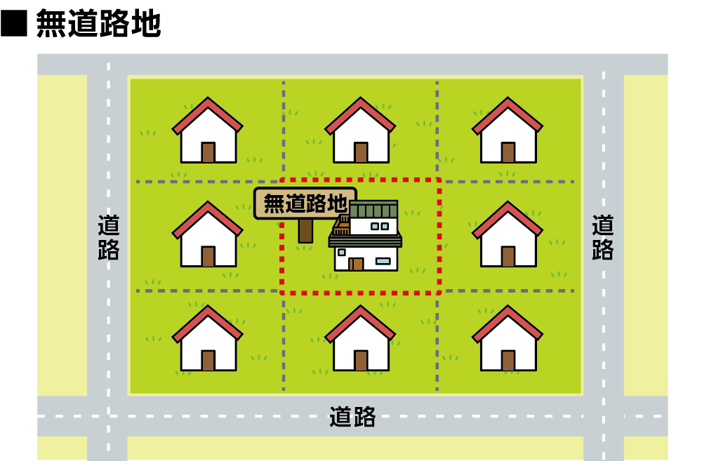 無道路地とは、建築基準法上の道路に接していない土地のことです。道路に接していない土地は、建物の建築や利用が難しいため、評価額が大きく減額されます。