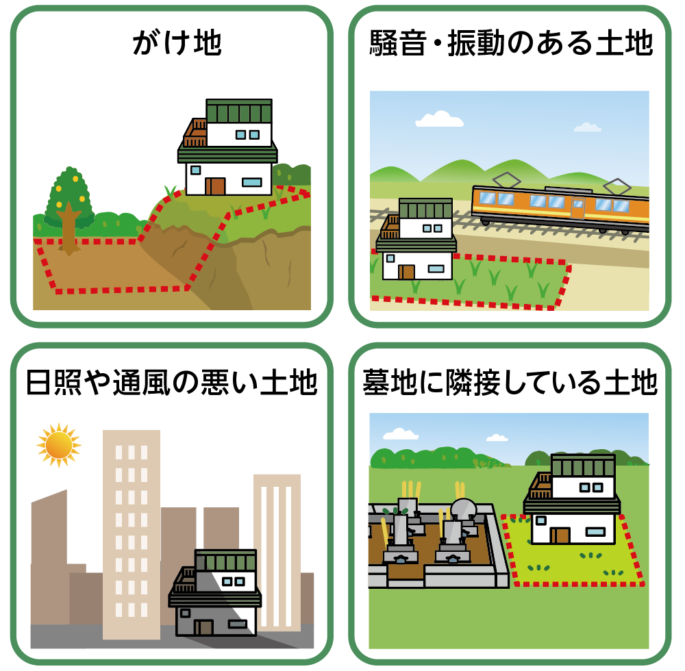 建築ができないわけではありませんが、心理的忌避や需要の低下により市場価値が下がりやすく、評価減につながることがあります。